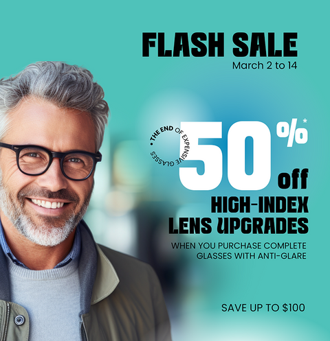 Get 50% off high-index lens upgrades when you purchase a complete pair with anti-glare